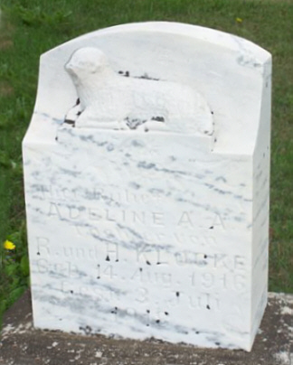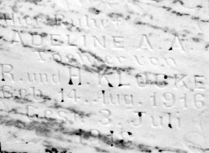 cx | Klocke, Adeline A. A. #1 | Aug 14 1916 | Jul 03 1918 | Tochter von R & H" (dau of R & H) | Reinhardt & Henrietta Klocke | ||
