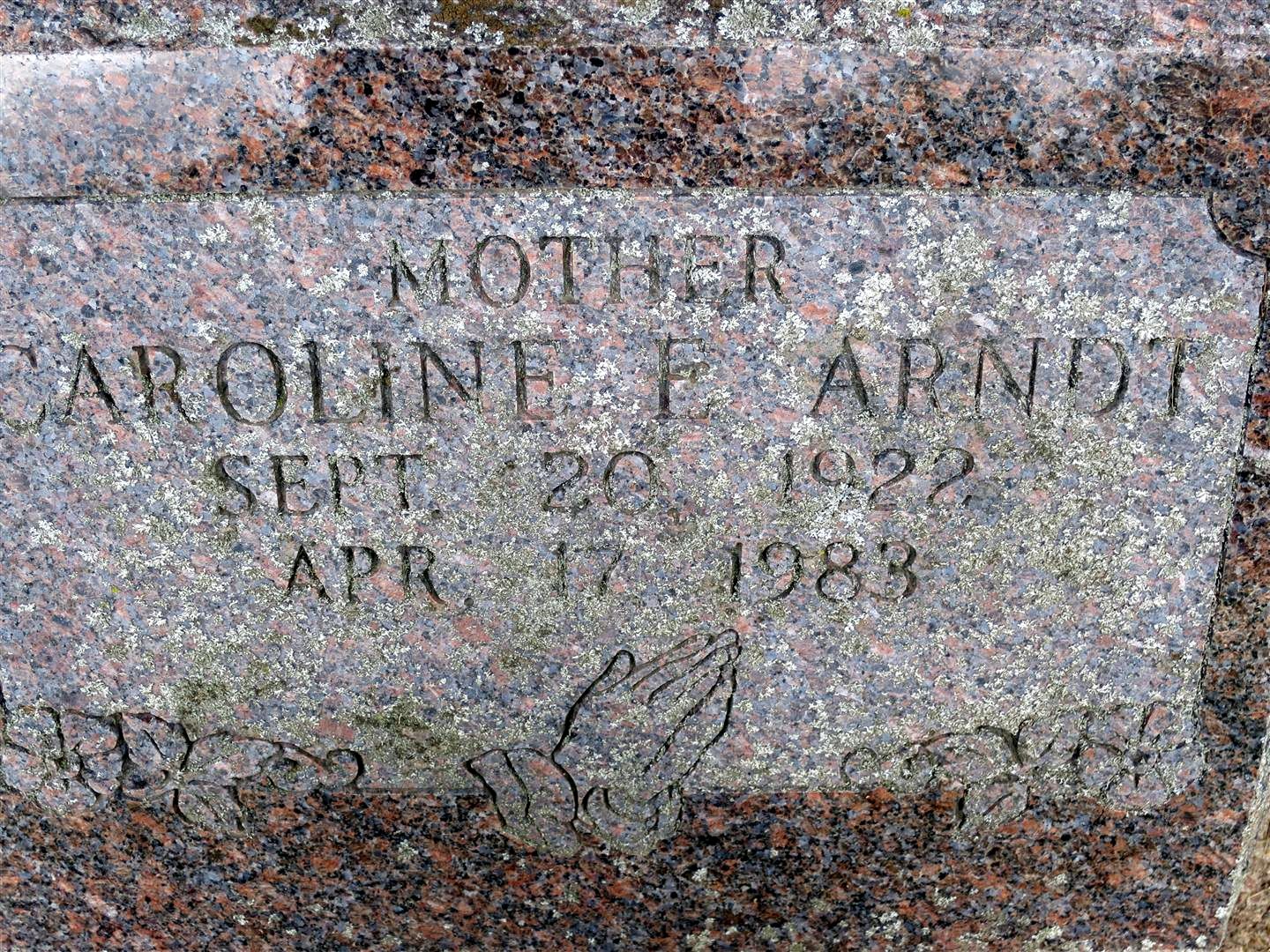 to | Arndt, Caroline E. | 20 Sep 1922 | 17 Apr 1983 | ? | Fred & Clara (Baldwin) Wiesner | ||