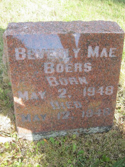 txo | Boers, Beverly Mae | 2-May-1948 | 12-May-1948 | Lawrence & Ruth (Stargardt) Boers | |||