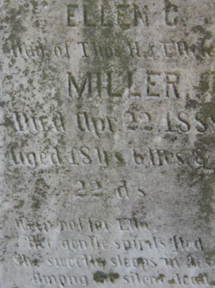 t | Miller, Ellen C. | 1-Oct | 1869 | 23-Apr | 1888 | 18 yr, 6 mo, 22 days | Thomas & Ellen Miller | ||
