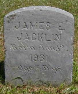tf | Jacklin, James E. | A-23 | 1 | 12 | 1931 | 1 | 15 | 1931 | Ellis & Nina "Cap" Jacklin | Parental info provided by Jackie Wyer | ||||