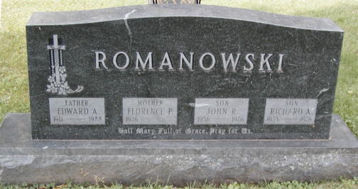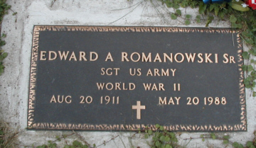 t | Romanowski, Edward A. Sr. | E-25-04 | 20-Aug-1911 | 20-May-1988 | WWII-Sgt US Army | Florence Kaleta | 24 Jan 1950 | |