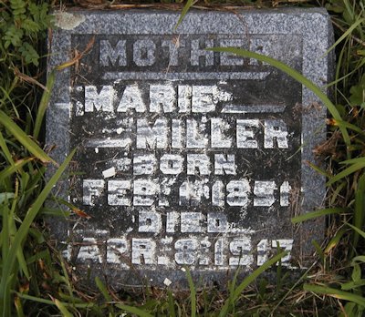to | Miller, Marie Caroline Lorenz | 09-02 | 1 Feb 1851 | 3 Apr 1917 | Mother; Obit spells name Moeller; Also says B. 1852 | John Miller | 24 Apr 1873 | Lorenz |