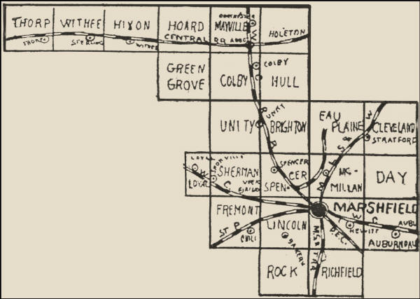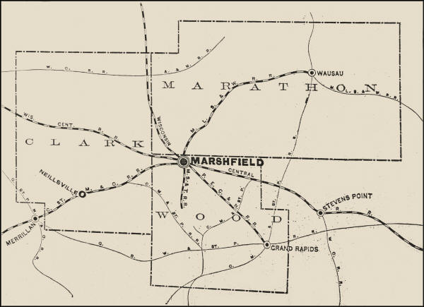 Below is presented a diagram of the three counties of Wood, Clark and Marathon, from which it is proposed to create the new county of Rivers. The diagram above, of the county of Rivers, is drawn on the same scale, and shows the comparatively small amount of territory taken from each county. The diagrams also show better than words can tell, the necessity of creating a new county. Such a county means economy, a more rapid development, lighter taxes, self government for a territory with a community of interests, and the greatest convenience for all the towns within the proposed new lines. Every point in the new county would have a direct line of railroad to the proposed new county seat. The diagram below shows the county seats of the old counties, and it will not take a great deal of study to understand the extraordinary expense and many inconveniences of long and tedious journeys, which are now necessary to get to them. Almost everyone living within the lines of the new county must now pass through Marshfield to get to their seat of government, either in Wood, Clark or Marathon counties.