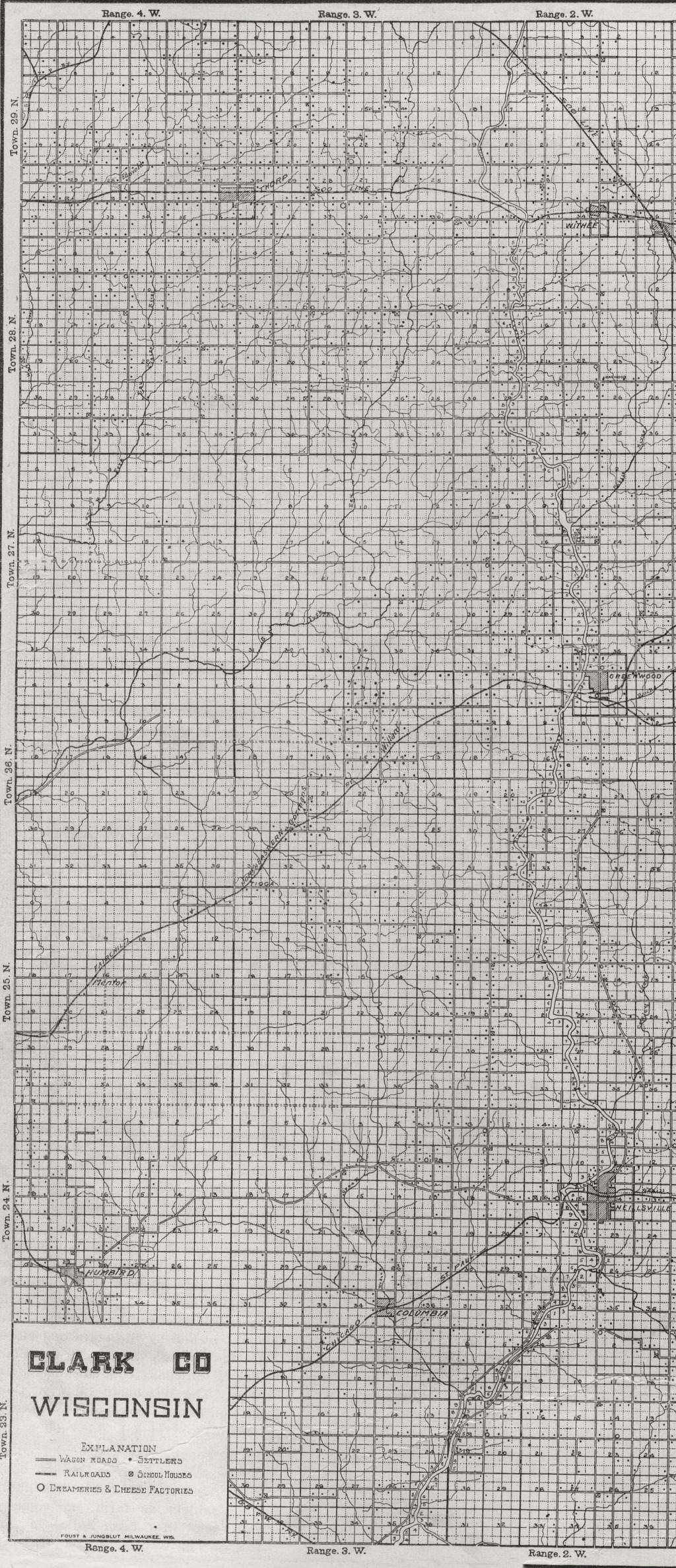 It was in 1853, on July 6th, that Clark County was created out of Jackson county, with the same area which it now contains, except that the north tier of towns was added from Taylor county in 1875. When organized, the county had but a single town — Pine Valley — and James O’Neill was chairman of the board of Supervisors and Hugh Wedge and James French were side supervisors; B. F. French, treasurer; Samuel C. Boardman, clerk. It was in this year that Samuel Weston with David Robinson came from Maine and located above Neillsville and established a village. Later he gave his name to the town of Weston. When the proceedings to have the county created were pending, the petition to the legislature that the county seat be located at Neillsville, was changed some way and Weston was substituted for Neillsville in which shape the petition was granted. As can be readily understood, this created consternation, indignation. and determination to offset the alleged treachery. An act of legislature was passed authorizing the people to vote a change from Weston to Neillsville and a lively struggle took place. There were two polling places, O’Neill’s tavern at the village and Parker’s tavern, 11 miles below and according to reliable reports imported voters were not rejected, The result at the Neillsville polling place was 4 majority for Weston while at Parker’s the vote resulted 21 in favor of Neillsville, making a net lead of 17 votes out of 104 cast, for Neillsville, thus determining probably for all time the location of the metropolis and county seat of the new county. In the fall of 1854 G. Hall was elected sheriff, B. F. French treasurer, S. C. Boardman county clerk and register of deeds. Chauncey Blakeslee as county judge was soon succeeded by R. Dewhurst. New arrivals came each year and the town of Levis was apportioned in 1857, Weston in 1859, Lynn in 1862, Loyal in 1863, Mentor in 1867, Grant in 1868, Eaton in 1870, Beaver in 1871; York, Hixon and Sherman in 1873; Colby, Unity, Mayville and Washburn in 1874; Sherwood Forest, Hewett and Warner in 1875; Thorp in 1876, Withee in 1880 and the newer towns in comparatively recent years. At the new county seat Jas. O’Neill appropriated four acres to village purposes and the same was surveyed and platted by Allen Boardman, surveyor. There were only two or three cabins, Robert Roix’s hotel, Dr. Baxter’s hut, and the humble domiciles of Jas. O’Neill, Nathan Boardman, Nathan Clapp, B. F. French and Mr. Dickey.