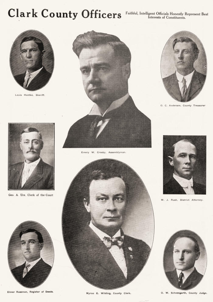 Anderson, O. C., County Treasurer [Biography] [Photo] Berg, C. C., Granton [Biography] [Photo] Clark, Homer C., Neillsville [Obituary] [Photo] Cresswell, Dr. W. B., Neillsville [Biography] [Photo] Crosby, Emery W., Assemblyman [Biography] [Photo] Davis, Fred W., Granton [Biography] [Photo] Devos, A. L., Neillsville [Biography] [Photo] Graves, A. A., Loyal [Biography] [Photo] Hantke, Louis, Sheriff [Obituary] [Photo] O'Neill, Hon. James, Judge of the Circuit Court [Biography] [Photo] Rossman, Elmer, Register of Deeds [Photo] Rush, W. J., District Attorney [Photo] Schoengarth, O. W., County Judge [Biography] [Photo] Sniteman, C. C., Neillsville [Biography] [Photo] Ure, George A., Clerk of the Court [Biography] [Photo] Wilding, Myron E., County Clerk [Biography #1] [Biography #2][ Photo] Woelffer, Victor C., Neillsville [Photo] Zimmerman, J. G., Neillsville [Biography] [Photo]