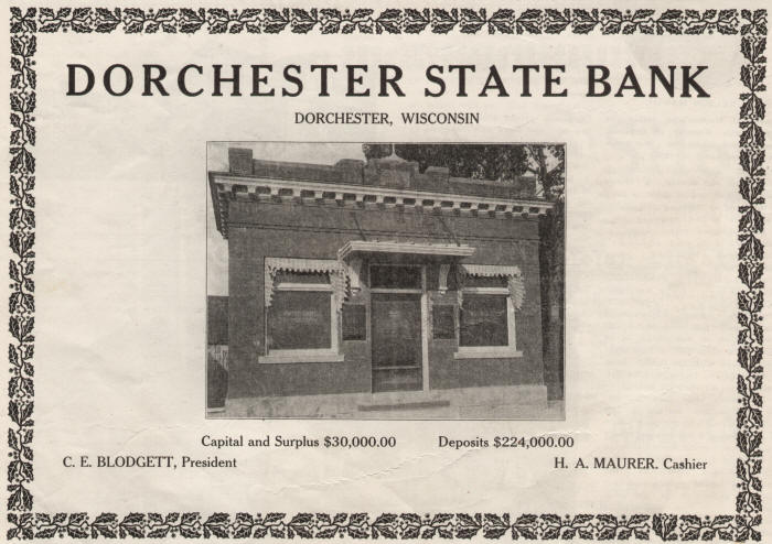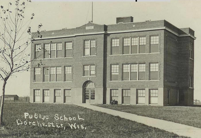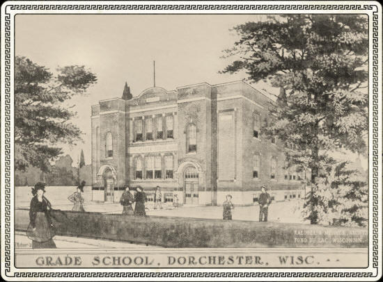 Dorchester lies between the Eau Pleine river three miles to the east and Poplar river a like distance to lie west, being on the water shed, one stream flowing into the Wisconsin river and the other being a part of the Black river system. It is on the Soo line and at one time was an important mill town, but in later years prospers as the center of a rich farming community. It has a population of about 600, and is one of the thrifty and progressive towns the northeastern corner of the county, two miles from one county, one and a half mile from another. The village is especially proud at present of its new grade school building, a cut of which is published herewith, erected at a cost of $12,000, 45 x 78 feet in dimensions, two story and basement.