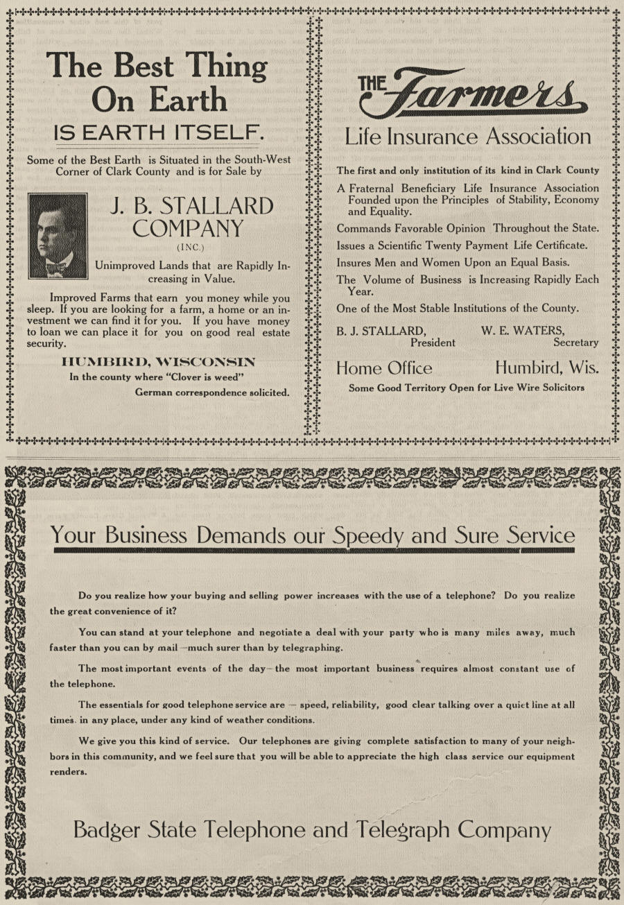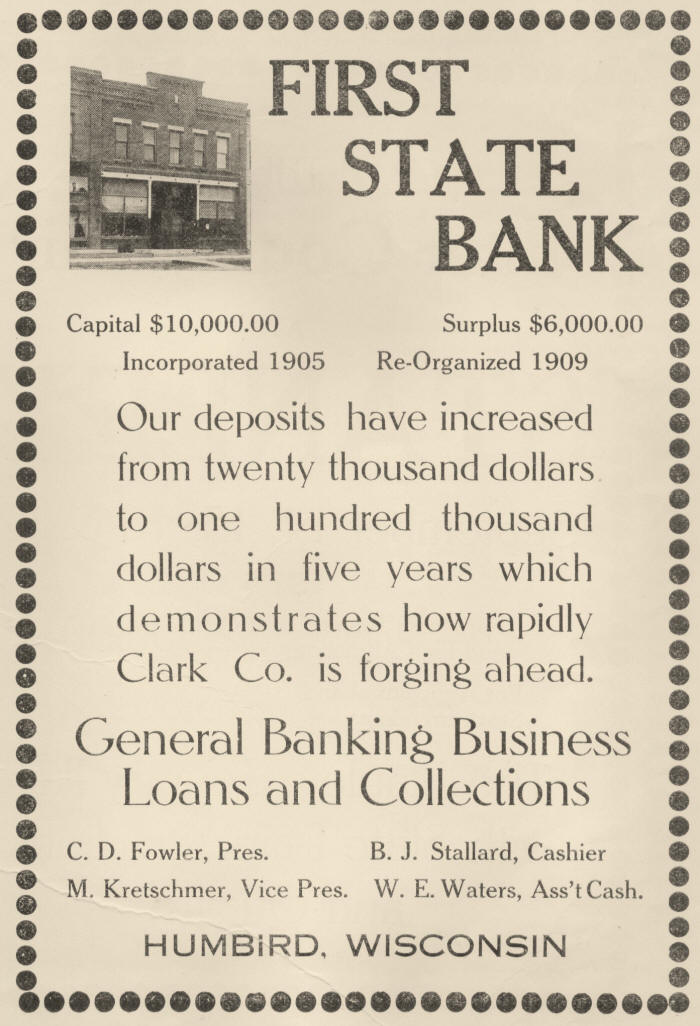 This thriving village is situated in the southwest corner of the county, prettily tucked in securely under the protection of an overhanging mound. It was named after Jacob Humbird, a railroad contractor, and laid out and platted in 1869. In 1872 the railroad which is now a part of the great Northwestern system was pushed through as far as Humbird which gave it a great deal of importance as the market place for Clark County, grain and lumber being shipped out and provisions and goods of every description being received and transported overland over the tote roads to the inland towns and, camps. It is a thriving town, surrounded by a rich and prosperous country and contains two hotels, a bank, two general stores, hardware store, blacksmith shop and implement house, millinery store, grist mill, drug store, meat market, garage, creamery, cheese factory, furniture store and undertaking establishment, livery, confectionery and so forth.