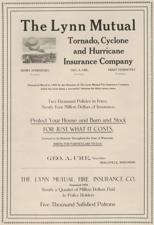 It was organized in 1878, Thomas Reed being the first president and Charles Sternitzky the first secretary. The first twenty-five policies were issued to David Hillert, Maple- works, Henry Neinas, Fremont, W. Behling, Nasonville, Wilhelm Lachman, Lynn, C. Sternitzky, Lynn, F. Pofahl, Lynn, John Hoover, Lynn, Alonzo Brooks, Lynn, Ernst Barth, Nasonville, Johann Garbisch, Mapleworks, James Sternitzky, Lynn, John Jackisch, Lynn, August Yankee, Lynn, George Kleinschmidt, Lynn, G. Wischulke, Lynn, Fred W. Davis., Mapleworks, Hiram J. Seager, Neillsville, Ernest Sternitzky, Lynn, Louis and Thomas Reed, Neillsville. In 1900 Henry Sternitzky was chosen secretary in place of his brother who died, and six years later George Ure was elected to that position a I has held it since.