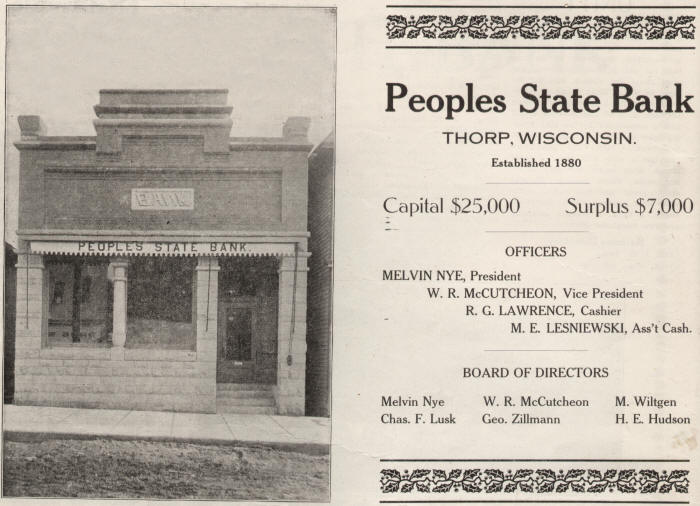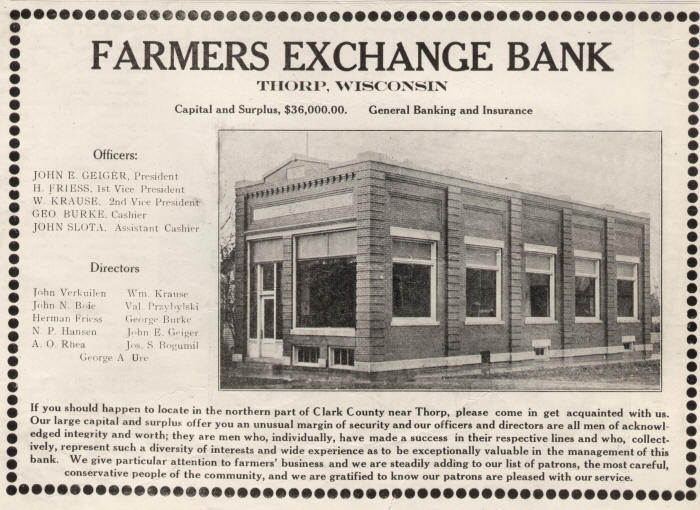 Thorp is a village in the northwestern corner of the county, on the Soo line and is known throughout the county as the center of one of the most thriving and prosperous Polish colonies in the United States. There are two big Catholic churches there, or rather one in the village proper and one about two miles from the village, the latter a Polish Catholic church, said to be the largest church structure in the country outside of a large city.