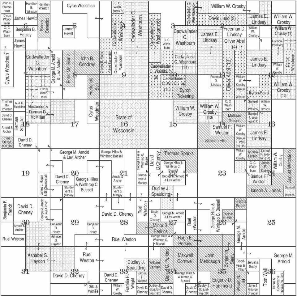 1. The scrip was assigned by Illinois Industrial University to William W. Crosby. The patent conflicts with a patent issued to James Hewitt, Oliver S. Woods, James E. Lindsay, and John B. Phelps, Accession No. WI0960__.183, on the N˝SEĽ (Section 1) 2. Lucinda Pond was the widow of the warrantee (Sections 1 and 12) 3. David Judd was also the warrantee (Section 2) 4. The warrant was assigned by Mary Ballows, former widow of warrantee, to Oliver Abel (Sections 2 and 11) 5. The warrant was assigned by Eliza W. Sollace, former widow of warrantee, to Cadwallader C. Washburn (Sections 2 and 3) 6. The warrant was assigned by William Stewart, guardian of Elizabeth A. Redman, minor child of deceased warrantee, to Nicholas Warfield; and by Lloyd Warfield and William Warfield, executors of the last will and testament of Nicholas Warfield, to Daniel F. Forshay; and by Daniel F. Forshay to Cadwallader C. Washburn (Sections 3 and 10) 7. The warrant was assigned by Caroline Picault, widow of warrantee, to Cadwallader C. Washburn (Section 4) 8. The warrant was assigned by William Hood to Charles B. Keene and Alfred Taylor (Section 9) 9. The warrant was assigned by Ludwig Schutz, "lawful attorney" of Anna Maria Schutz, mother and heir at-law of warrantee, to William Clemens Jr.; and by William Clemens Jr. to George Woodman; and by George Woodman to Cadwallader C. Washburn (Section 10) 10. The warrant was assigned by Clement W. Bennett, administrator of the estate of deceased warrantee to Cadwallader C. Washburn (Section 10) 11. The scrip was assigned by Illinois Industrial University to Cadwallader C. Washburn (Section 10) 12. The warrant was assigned by Orlando J. Durand to Oliver Abel (Section 11) 13. The scrip was assigned by Illinois Industrial University to William W. Crosby (Sections 12 and 14) 14. The warrant issued to Eunice W. Gould, widow of warrantee, was assigned to Samuel F. Weston (Section 13) 15. The warrant issued to Lavinia Millspaugh, widow of warrantee, was assigned to Samuel F. Weston (Section 14) 16. The patentees are Carl Stange, Paul Stange, Ferdinand Stange, Fred Stange, Mary Stange, and Gottlieb Stange (Section 18) 17. The warrant issued to Lydia Parlin, widow of warrantee, was assigned to Samuel F. Weston (Section 24) 18. The warrant was assigned by Sarah B. McCaskill; Commissioner appointed by the Probate board of Butler County, Alabama; to Dudley J. Spaulding (Section 34) 19. The warrant was assigned by Ellen M. Clark, widow of warrantee, to Dudley J. Spaulding (Section 35) |