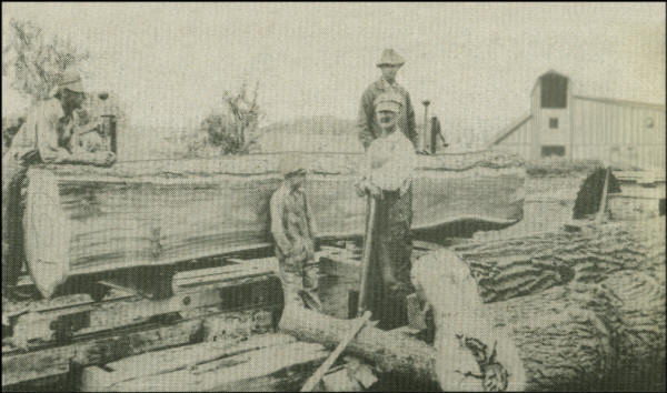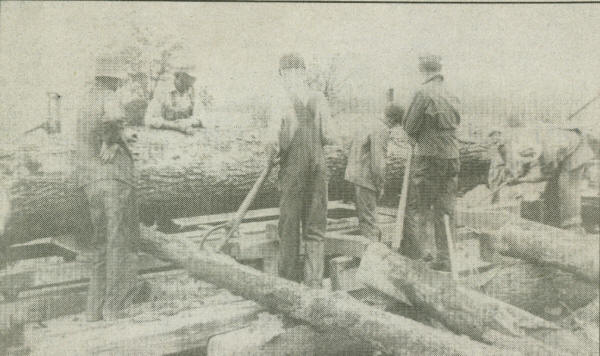 Part of a “rollway” is shown in the front of this photo. A rollway consisted of logs that were placed upon other logs at right angels to form a “track” onto which the log to be sawn could be rolled up on the carriage of the “saw mill.” The logs were either hauled on wagons or on sleds (horse drawn) to the rollway, where at this point they were unloaded. This ash log has just been rolled onto the carriage with the use of cant-hooks and human strength. On the left side above the log, is the device that was used to secure the log down onto the carriage (dog ‘em down). There were three of these on the carriage, of which a pointed hook was levered down into the log to hold the log in place. Pictured in this photo are (L-R) Martin Garbisch, Eddie Heintz, William Joyce Jr., Wilbur Joyce, Jake Heintz, Walter Joyce and Louie Haas.