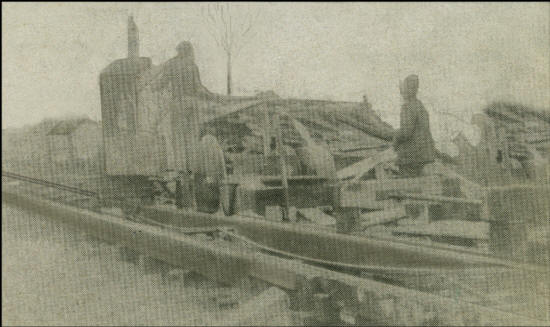 The carriage onto which the log was placed is shown here on the left. The carriage rolled on small wheels back ‘n forth on the platform, with the aid of belt driven power. Part of the chain that operated the carriage is shown here in the foreground. A gauge was set to determine the thickness of the board. Until the log was “squared up,” the outside boards were run through an “edger” to remove the outside bark and to square-up the board. Shown in the background is a pile of edgings. Edging served many purposes such as kindling in starting fires, or placed between the boards as they were stacked in piles for drying. (L-R) William Joyce, Jr., Bob Elmhorst and Martin Garbisch