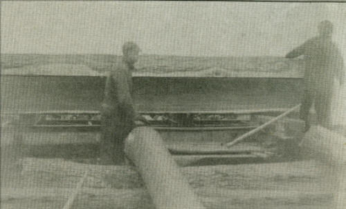 William Joyce, Jr., (left) and William Joyce Sr., (right), are shown here standing next to a log that is partially sawn. In the front of this photo is shown the rollway, depicting how the logs would lay at right angles to form the track to the carriage. The “rollway” logs could be quite large in size, as the “sawmill” could be some distance off of the ground.