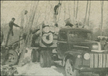 Clayton “Duke” Boon is shown here operating the log-jammer, with Alfred Boon on top of the load, and “Pat” Boon far right. They are shown logging, south of Grunke”s Cheese Factory, which was located on County Trunk “H” east of Highway 73. The logs on this truck were taken to Hastreiter’s Mill, Marshfield, which was located on Oak Street, where Schierl Tire and the Melody Gardens Roller Rink are now located. |