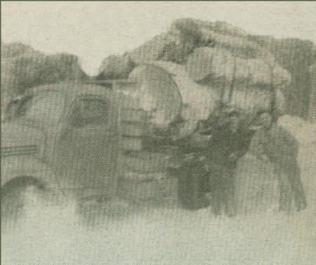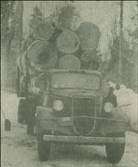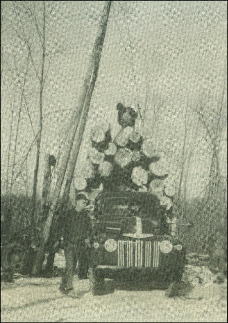 Bill Joyce is shown here walking around a 1946 Ford truck while it was being loaded with logs. On the left one can see the log-jammer, with a cable running through a pulley that was attached at the top of the two poles. At the end of the cable, which ended in a fork, were two hooks (pup hooks). These hooks were placed on the ends of each log, and when tightened, held the log firmly. The winch on the log-jammer tightened the cable, lifting it upward with the help of poles, and the log was then placed on the truck.