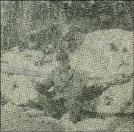 Noon meals were usually a packed lunch, which was taken along out to the woods. Birds, such as chick-a-dees and Canadian jays, would become quite tame in their search for food. If you look closely in this photo, a chick-a-dee is helping himself to a sandwich in the right hand of Bill Joyce.