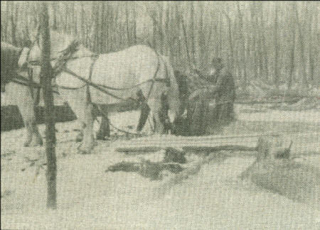 In this 1947 photo, it is evident that big stout teams of horses were required to withstand the grueling, cold work of logging. While most of the “giants” could be considered gently, not all horses were, as was told of a “killer” horse in a Michigan camp, who had grabbed and killed one man. In this photo are (L-R) Alfred Boon (owner of the team) and Clint Aspen, logging south of Grunke’s Cheese Factory off of County Trunk “H”.