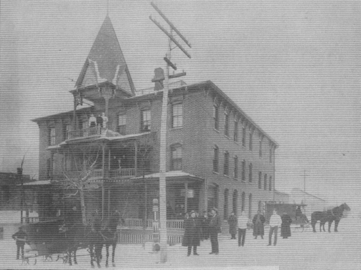 The O'Neill House on 6th and Hewett Street. It was a busy day for the hotel's business when this photo was taken in 1906 or 1907. The horses and buggy near the front door was probably delivering guests, whereas the horses and buggy at 6th Street side door was delivering food, etc. Notice the barber poles, one in front and one on the side of the building as there was a barber shop in the hotel's main floor. Also, there was a tavern, the lobby, a large dining room and kitchen on the main floor. Hotel waiter and townspeople stand near the hotel. Some of the employees were on the third floor porch, and hotel guests on the second floor porch when the picture was taken. The spire over the porch was decoratively built and painted to give the building a touch of "class" and elegance to an elegant hotel of Neillsville. (Photo courtesy of the Clark County Historical Society's Jail Museum and of the Ernie Snyder collection.) |