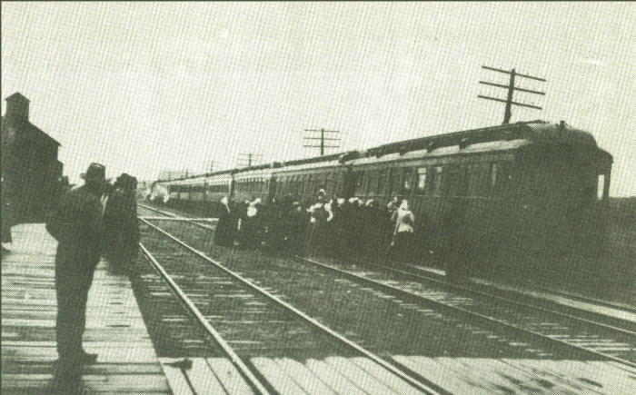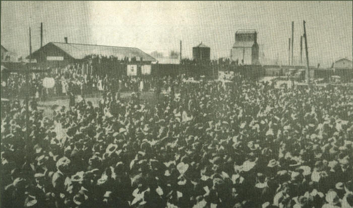 A large crowd of friends and relatives gathered at the train depot to see their young men leaving for the military service at the beginning of World War I. |