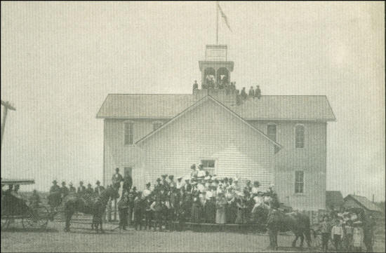The Columbia school was the site of many community events like the Fourth of July celebration in the picture. The roof also provided a place for ambitious Halloween pranksters to reassemble buggies. As the photo indicates some such boys decided to perch upon the roof for the photo. (Photo and information courtesy of Ruby Yndogliato) |
