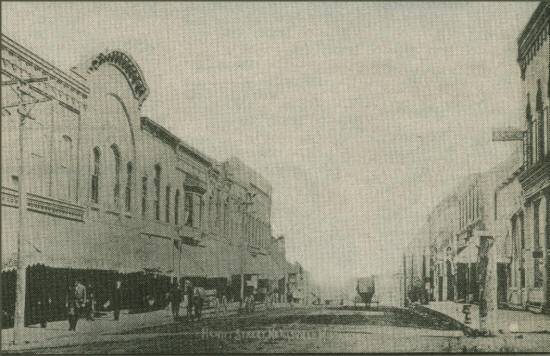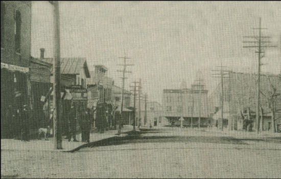 The 500 block of Hewett Street, Neillsville during the horse and buggy days about 1900. The store on the far left corner was that of W. J. Marsh dry goods. Across the street on far right corner was the Bernhardt Tragsdorf and Rella Balch merchandise store. |