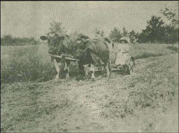 Mrs. Schwedlund and a team of oxen mowing hay in the Columbia area during the early ‘20’s. As you will notice, it was before “the ladies wearing blue jeans era.” |