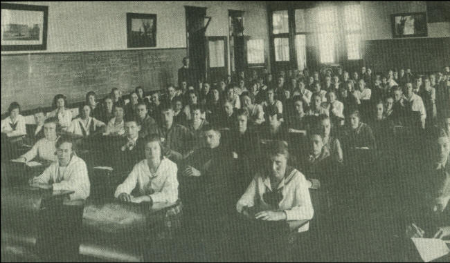 These two photos were taken in the main room or assembly room of Neillsville High School in 1920. The main room of high schools in that era had various purposes. It was used for study hall when students had a free hour from class room studies. Also, some classes were held in that room, as the photo shows a full length blackboard on two sides.