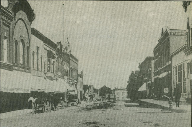 Hewett Street, looking north, Neillsville: Photo taken circa 1900. On the far left is the W. J. Marsh Dry Goods (5th Street and Hewett corner). At the opposite side, with only a portion of the building visible is the Tragsdorf building, now the site of Neillsville Professional Building.