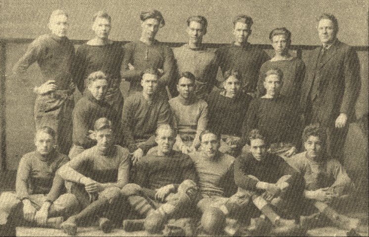 Reading from left to right: Top row: Allen, right guard; R. Thompson, tackle; Ruddock, left half-back; Ure, right half-back; Brameld, guard; Olson, left end; Kuenning, coach. Middle row: Hauge, tackle; Bronstad, right tackle; Arndt, left end; Buffington, left guard; Wagner center. Bottom row: Kurth, tackle; F. Thompson, right end; Williamson, full back; Svirnoff, quarter back; Crosby, guard; Weaver, left tackle. (Quotes from 1921 High School Annual) The 1921 football season of the Neillsville High was the most successful in its history. The opening day of practice saw about twenty men out, but many had not had enough knowledge of football to stick; nevertheless enough men stayed out to organize a good fast squad. Coach Kuenning selected his men for their respective positions very carefully and thereby developed a squad that worked together like a clock. |