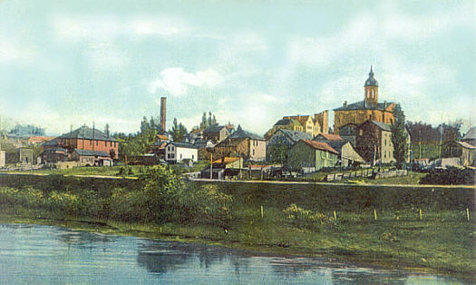 An old view taken from the O’Neill Creek Bridge; Visible is the Neillsville Brewery, the first standpipe in the back-ground, which collapsed in 1926, also, the courthouse and Wisconsin (Foster) Hotel on the right side, and in the foreground, O’Neill Pond, where ice was obtained for brewery needs.