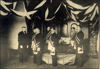 Early Masonic funeral, left to right, back row: Pete Johnson (undertaker) Matt Kappelan, George Trogner and Sy Stockwell. Front row: Mont Brown, Will Klopf and Joe Morely |