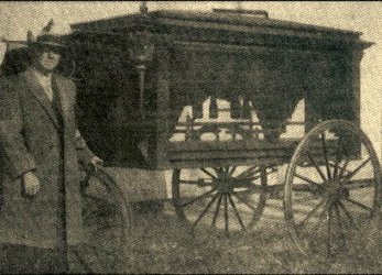 A hearse, built in the 1800’s, designed to be horse drawn, was used for funerals in Neillsville. The last trip it is known to have made was c.1940. Millard Coles, a former funeral director, is shown by the hearse. |