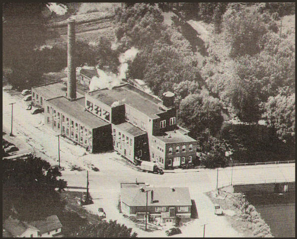 Neillsville Condensed Milk Products building was located along O'Neill Creek, now site of the Fire Hall. The aerial view, circa 1940, included the American Legion Hall and parking lot, as well as the partially visible James O'Neill House. Hewett and Eighth Streets joined by the condensary. |