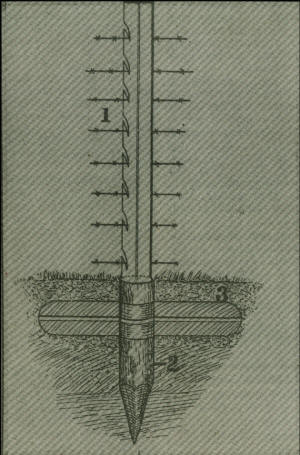 The steel fence post, patented by Emery Bruley, manufactured and sold throughout our country and Europe in the early 1900’s. The 4 to 6 foot Bessemer Steel Post, Figure 2, represents the base, made of wrought iron tubing, 18 or 24 inches long, with one end pointed. Figure 3 is an iron brace 12 by 3 inches, which was only necessary in very wet ground. The weight of the post, complete, was 10 pounds.