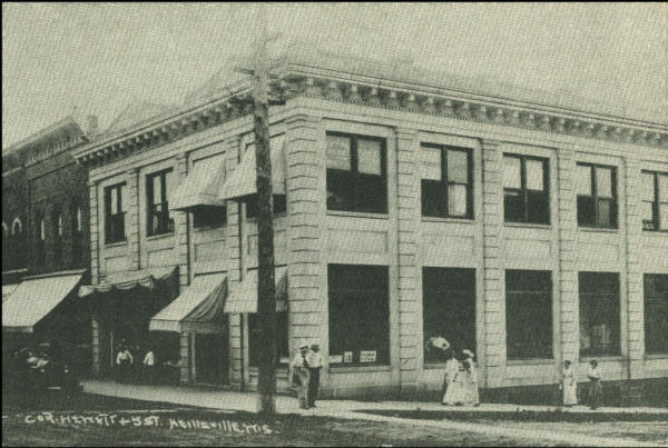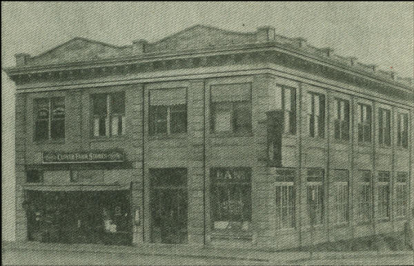 The First National Bank building, corner of Hewett and 5th Streets, was built by Charles Cornelius in 1910. That same year, Cornelius built his fine, large 3-story home on the corner of 2nd and Clay Streets.