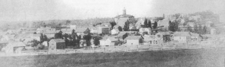 A view of the City of Neillsville as it appeared during the late 1800's. The old courthouse was the tallest building on the horizon, shown near the center of the photograph. The wooded rail fence was built along what was later to be Clay Street. Houses on Grand Avenue were built up to 2nd Street, at that time the south edge of the city. |