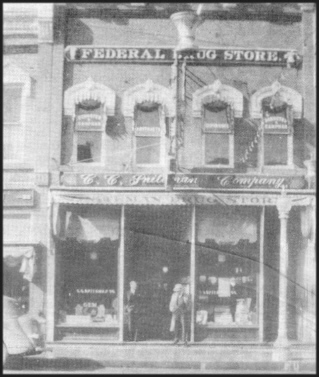 C. C. Sniteman Company's Federal Drug Store as it appeared in 1937. Note one of the original lamp posts in front of the store, which were dismantled some years later for lamps of a more modern and illuminating design. Hewett Street was resurfaced recently, and many city residents requested a replica of the 1930's lamp posts to be positioned along the Street once again. Looking at the lamp post in the photo and those along the street today, the task of simulating the originals was well done.