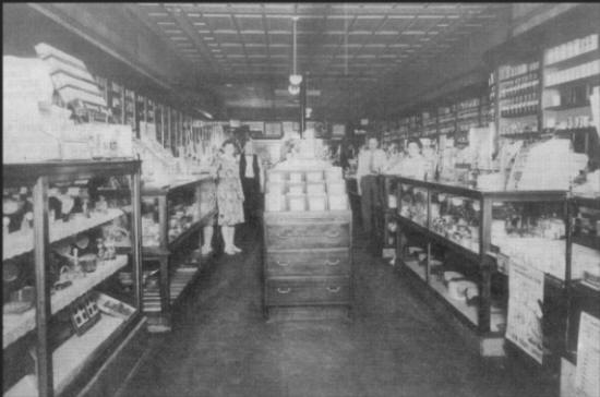 Viewing the inside of the drug store as it appeared c. 1940. Left to right: Agnes Meinholdt, George Sontag, Dave Parry and Marge Hauri, who staffed the business during that time.