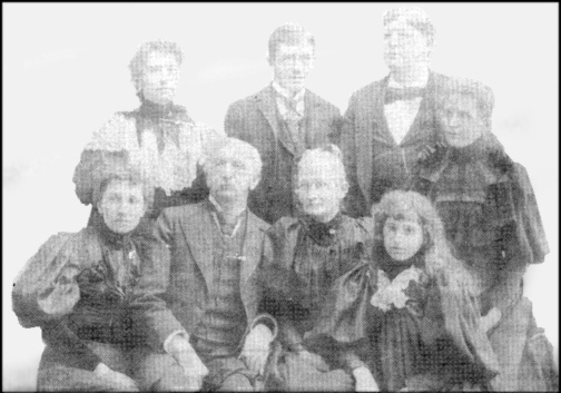 The Schuster family Front row: Gertie, Mr. and Mrs. Herman Schuster, and Irma. Second row: Carrie Lee, Kernel, Jeff and Mattie. |