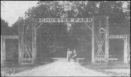 Schuster Park entrance as it was originally marked with a main entrance plus small entrance on each side for pedestrians and tourists. A shale covered road wound its way through the park and has since been hard surfaced. The entrance has been replaced with two "stone sentinels." |
