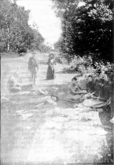 The Schusters enjoying a picnic. Counter clockwise with bottom left: Charlie Lee, Lute Marsh, Jeff Schuster, Carrie Lee, Gertie Schuster, Edithe and Mattie Shcuster. |