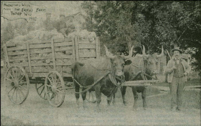 A wagon load of wool, pulled by a team of oxen, as it was being hauled from the Friess farm to a market in Thorp during 1912. Two young boys must have had a soft, cushiony ride as they sat on top of that load of wool being allowed to go to town with their dad. (Photo courtesy of Pat (North) Struble of Neillsville).