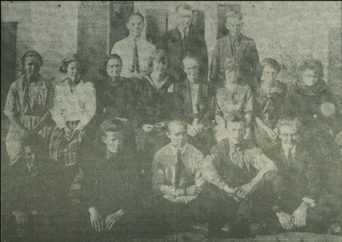 The Thorp High School Graduation Class of 1923: Back Row (L-R) Tom Deanchamp, deceased, Mr. John E. Kirowski, Principal, Frank Schmidt. Middle row (L-R): Tekla Heideman, Linda Walsdorf, Kathryn Czyzewicz, Eva Kronberg, Elsie Verkuilen, Tracy Zaborowski, Hester Bradshaw, Pearl Aucutt. Front Row (L-R): Elmer Broeren, Waldo Alberts, Leighton Morris, John Kurtinaitis, deceased, Kenneth Lindquist. John Kurtinaitis was Valedictorian and Eva Kronberg was Salutatorian.