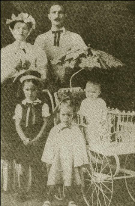Tim, 7 months, sits in a 75 year-old buggy. At left Mike 4, and Barbara, 2. Dorothy stands by her husband, Ed.