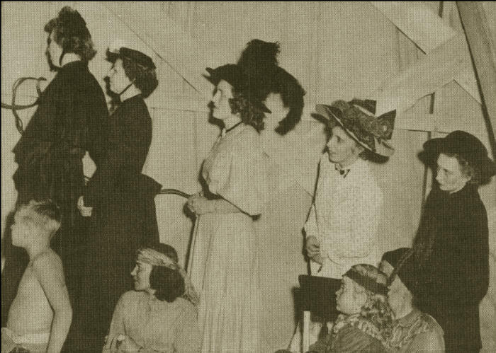 A style show held at the county fairgrounds was sponsored by the B. P. W. This scene photo was taken behind the stage as participants lined up, ready for their debut. Left to right are; E. Rosenberg, Augie Olson, Rosie Kunze, Ruth Ebert and Billie Thompson (Photos courtesy of Ruth Ebert)