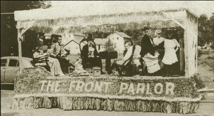 Another unique float depicted an old time church scene. It was sponsored by the United Methodist Church. On the float were, left to right: Iris Musil (organist) and Rev/ Nulton (preacher); first pew: August Janke (janitor), Catherine (Manz) Cowell, girl and boy unidentified; second pew; Patricia (Allen) Wells, Mrs. Pete (Evelyn) Smith and Carol Peterson; third row; Mr. and Mrs. Glen Ketchum, two ladies on right not identified.