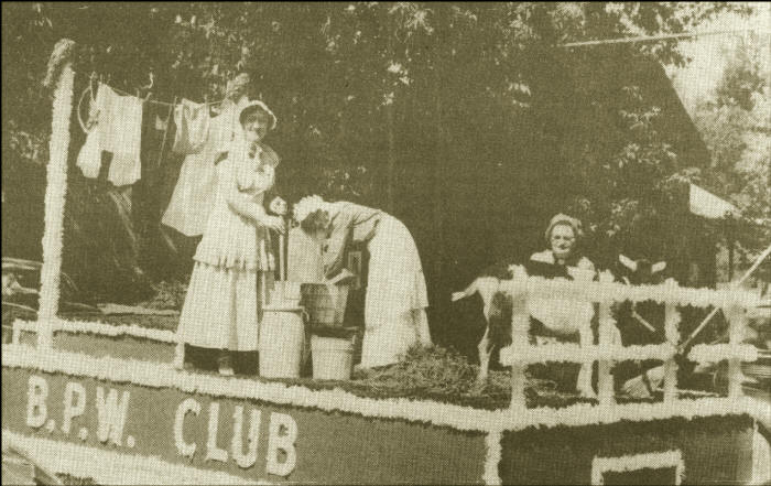 The life of the pioneer woman was portrayed by left to right: Edna Georgas, churning butter; Hilda Kurth, washing clothes on a scrub board and Ann Hoesly, milking a goat. The float was made up by the Business & Professional Women’s Club Neillsville. (Photos courtesy of Ruth Ebert)