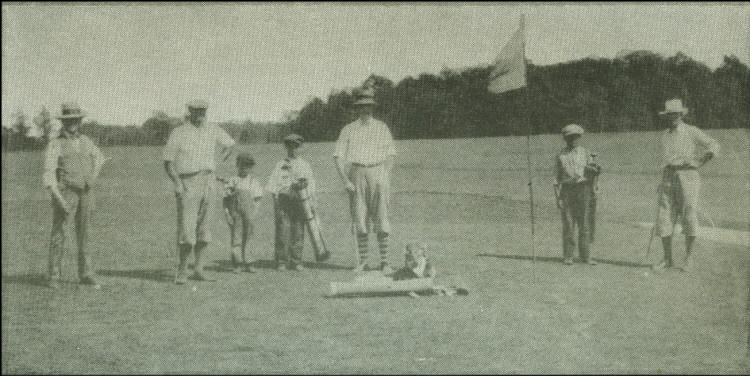 A foursome who golfed on the Neillsville Country Club (Snyder) Course was left to right: Fred Balch, Ernie Snyder, Roy Schmedel and Levi Williamson. The caddies are not known. The dog, “Old Pete,” belonged to Ernie.
