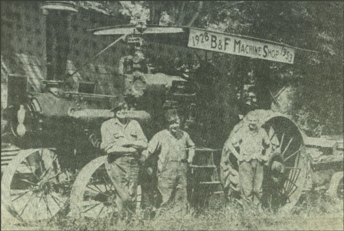 An old traction steam engine made its way along he Centennial Parade route and was entered by the B & F Machine Shop. As the sign indicates, the B & F Shop started business in 1928, owned by Earl “Slim” Bruhn and Max Feuerstein. Those standing by the old engine were William Schwellenbach, at left, who operated the engine, Max Feuerstein and Jay Bruhn. Steam engines proceeded tractors and w3ere used for powering threshing machines in the farming communities.